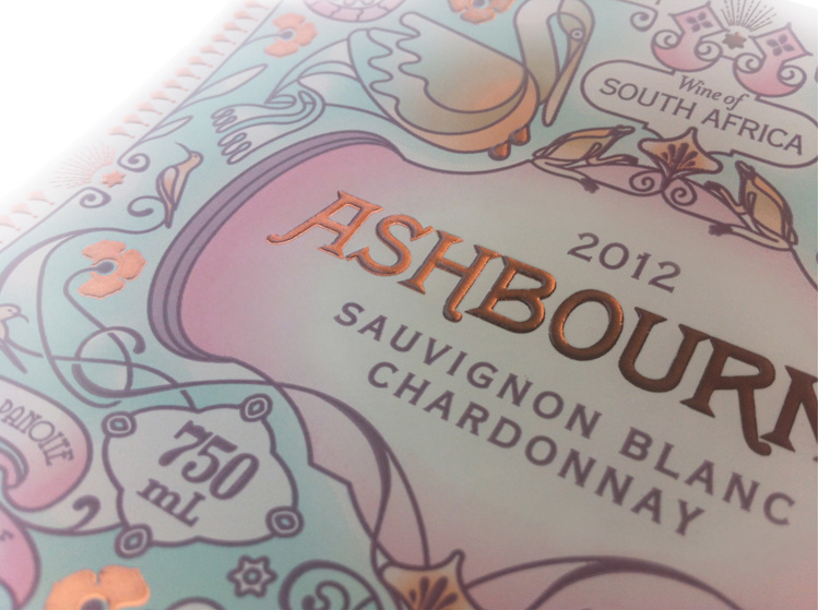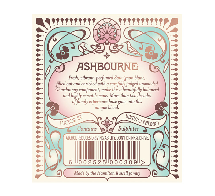 Hamilton Russel Wine Estate commissioned me to design a wine label for their sauvignon blanc chardonnay blend, Ashbourne. The brief asked that I incorporate aspects of the family crest, combined with elements from the flora and fauna of the Hemel-en-Aarde Valley in a Belle Époque style. I was fortunate enough to work on a brief that allowed me to achieve a complex finish. The printing required 5 spot colours, a foil and a spot varnish.