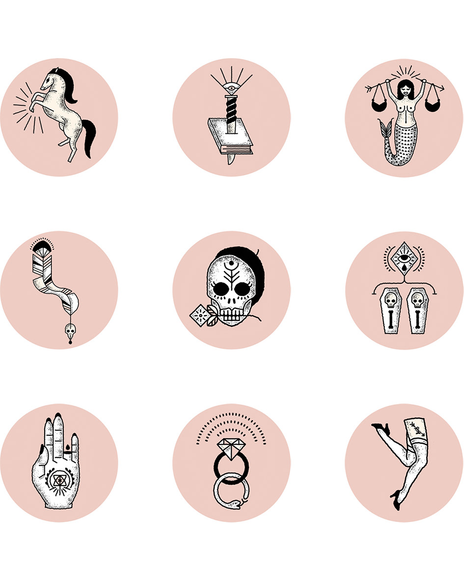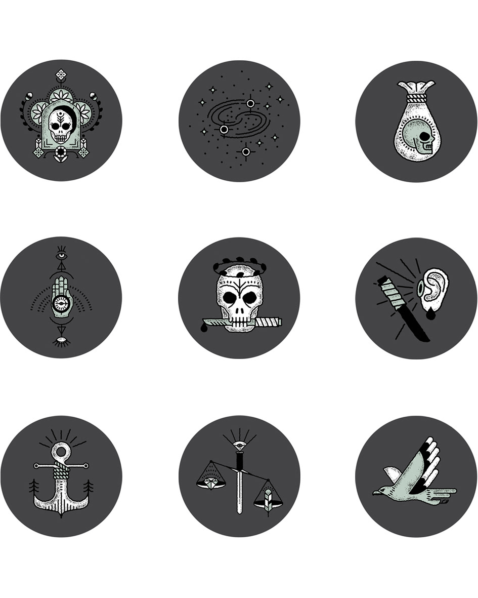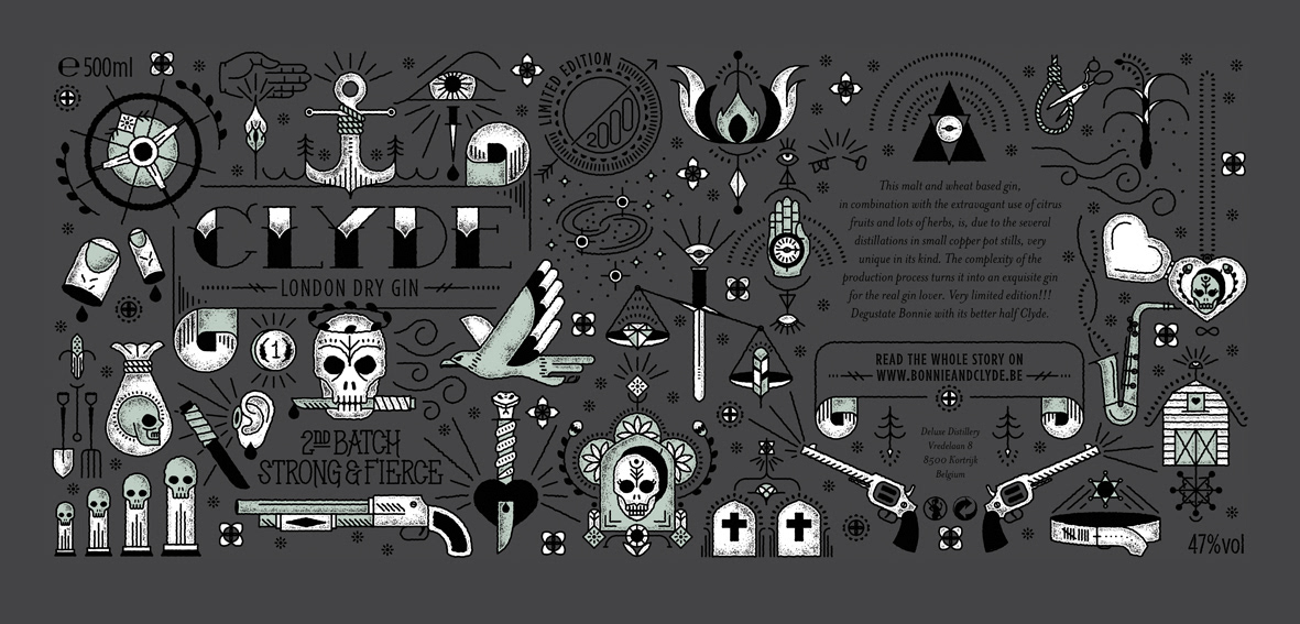 After the success of the first batch of Bonnie & Clyde, Deluxe Distillery commissioned me to illustrate the second batch of limited edition gin. The illustrations take on symbolic meanings taking inspiration from tattoo style line work.