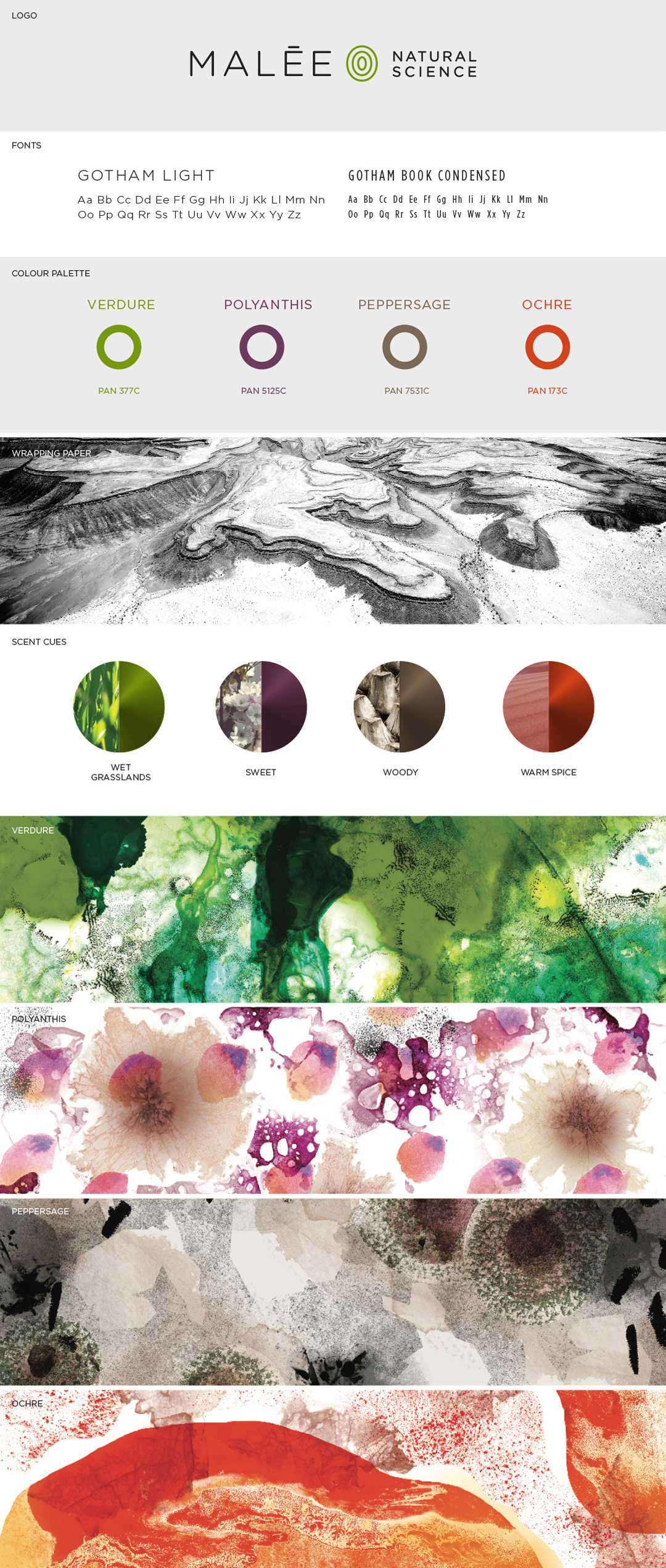 Inspired by the rich landscapes, alluring scents and ancient wisdom of Africa, I re-designed the branding and packaging for the fragrance and body care range Malée. The blind embossed detail was inspired by scarification, found in many African cultures. I also created a series of textured patterns inspired by various African landscapes and used these to depict the different scents in the range.